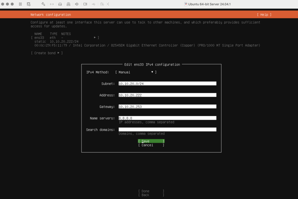- Pada konfigurasi network, perhatikan apakah sudah mendapatkan IP Address dari DHCP Server atau belum. IP Address dapat diisi dan disesuaikan. Pada tutorial ini penulis menggunakan IP Static sesuai dengan konfigurasi Lab.