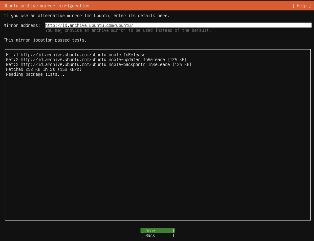 - Perhatikan pada konfigurasi mirror, jika tidak ada error berarti VM sudah terkoneksi ke internet dan lanjut instalasinya ke step berikutnya.