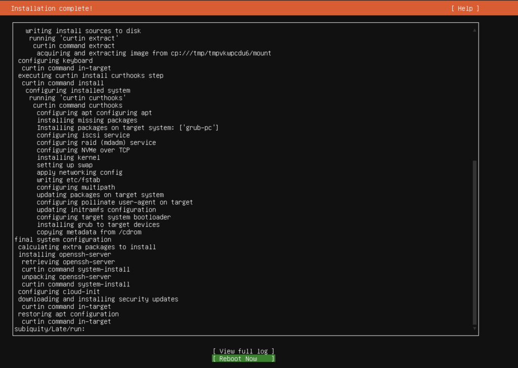 - setelah instalasi selesai, pilih reboot now lalu tunggu hingga restart selesai dan instalasi ubuntu telah selesai